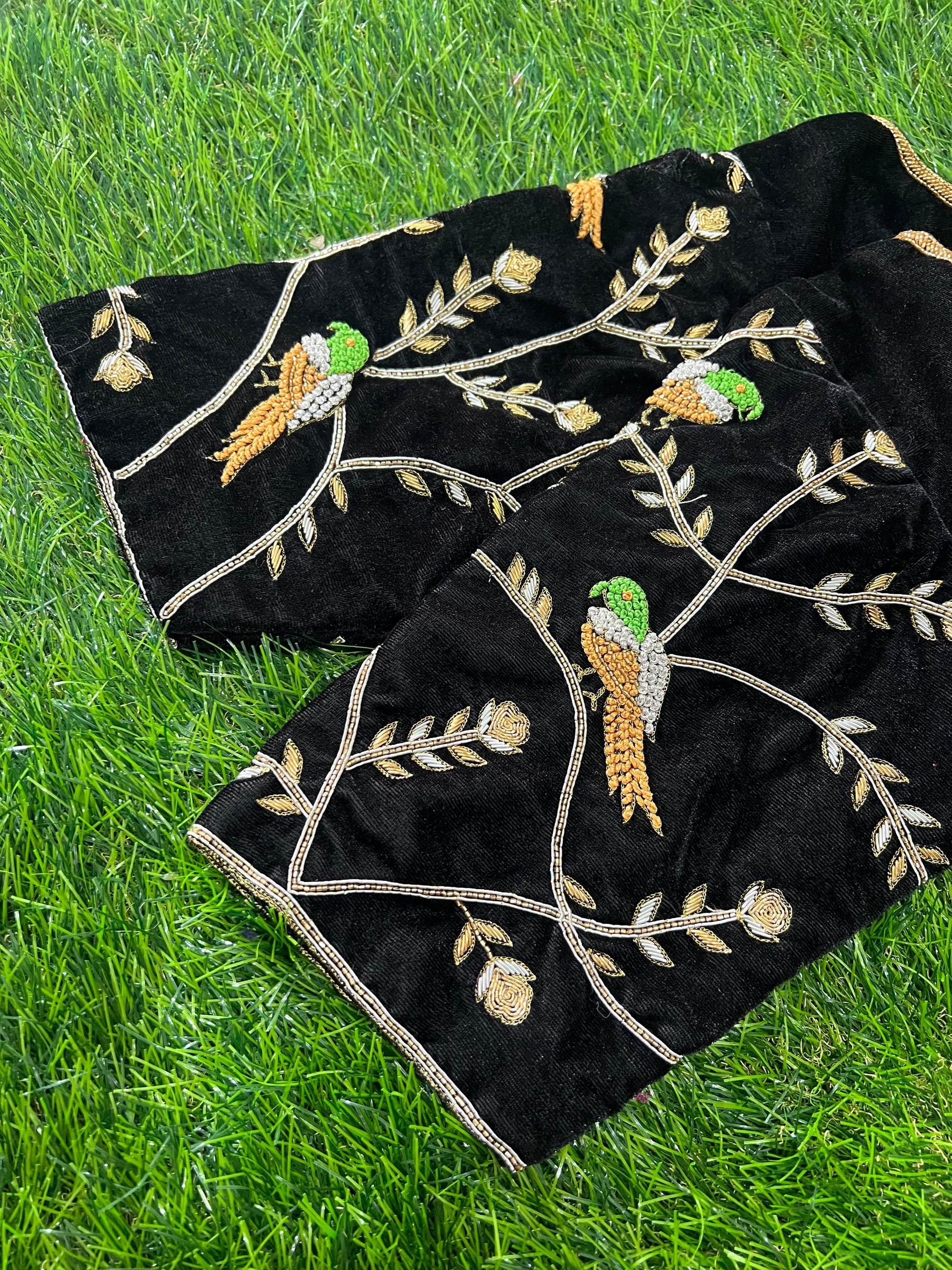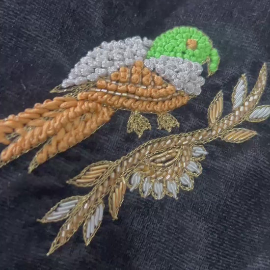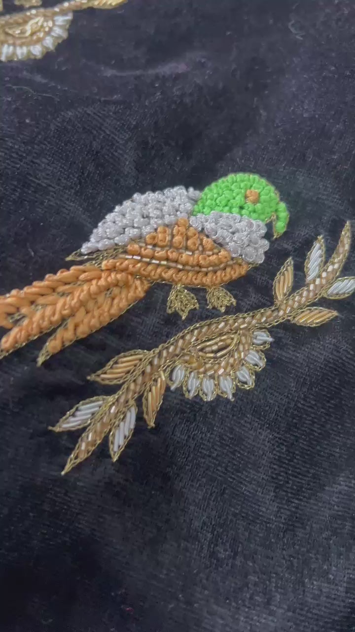 Elevate your festive and wedding look with our luxurious black velvet blouse piece, adorned with intricate hand-embroidered bird motifs. The richness of velvet combined with fine detailing makes it a timeless statement for any saree.