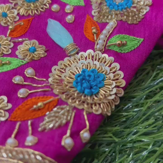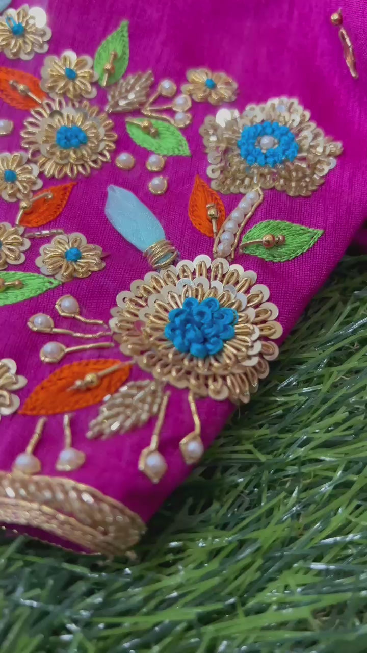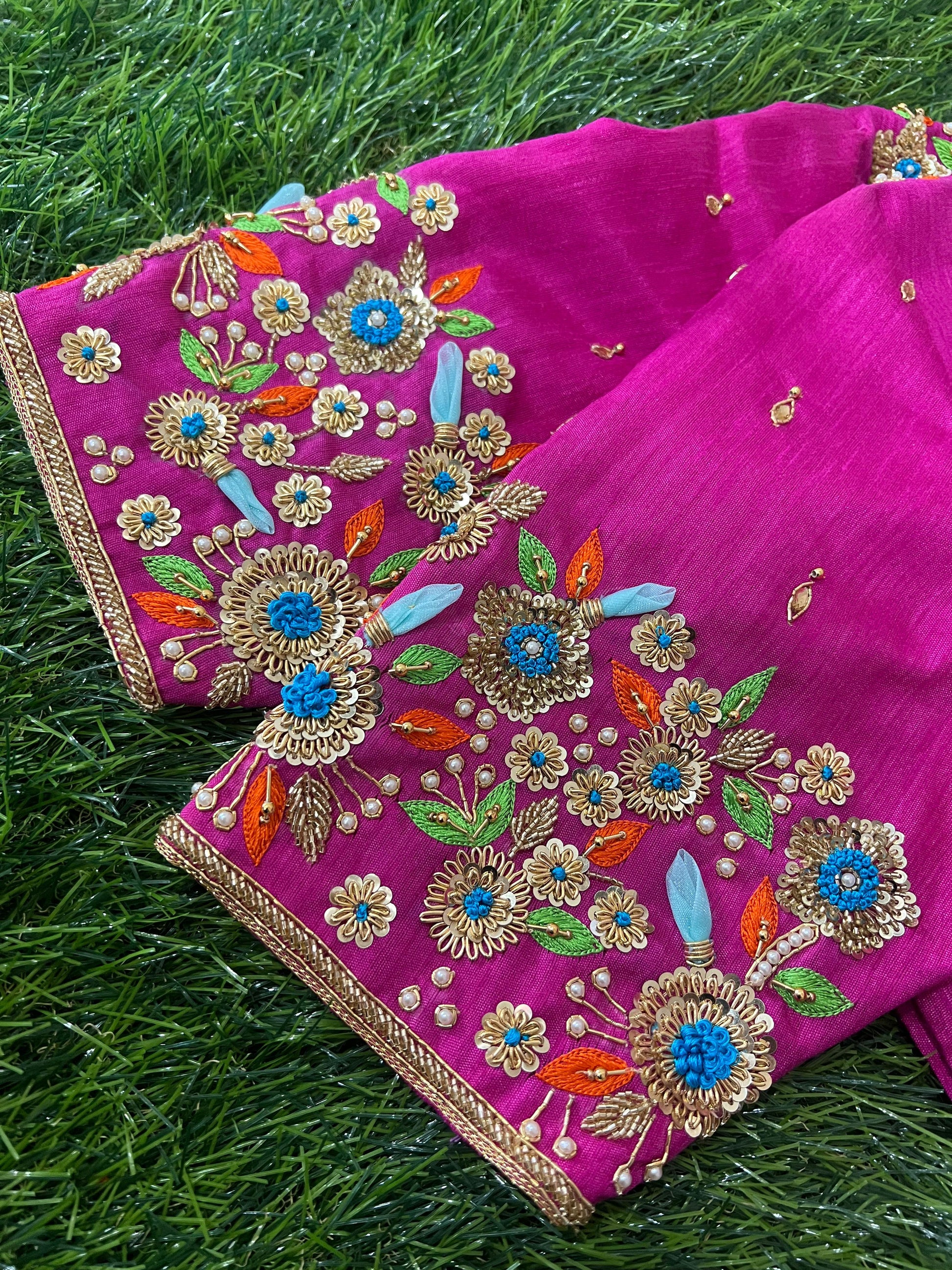 Step into the spotlight with our hot pink full-sleeves blouse, beautifully crafted with 3D organza embellishments and intricate zardosi detailing.