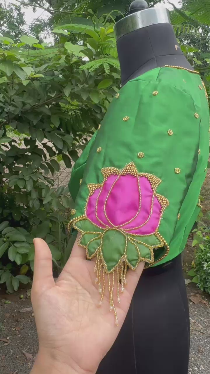 Bring home a masterpiece with this elegant hand-painted lotus blouse, crafted on premium Pattu silk. Each blouse is a blend of artistic hand-painting and delicate hand embroidery, making it a one-of-a-kind creation.